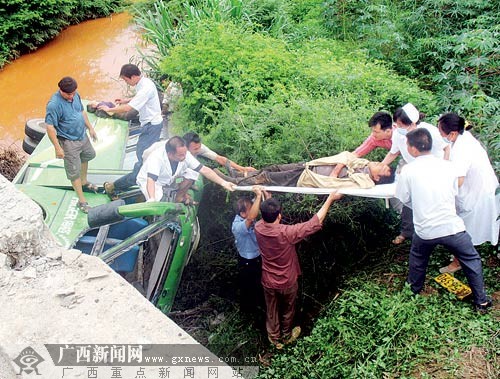 6月29日上午,322國(guó)道南寧市吳圩鎮(zhèn)那花橋發(fā)生一起造成1死46傷的交通事故,交警初步調(diào)查后認(rèn)為這起事故是由一壺潤(rùn)滑油滲漏引起的。一輛摩托車駛過(guò)淌有潤(rùn)滑油的路面時(shí)側(cè)翻,后面超載的客車為避讓前面的摩托車,沖進(jìn)落差五六米的水溝,造成40多人受傷被困。事發(fā)后,受傷乘客“手拉手”自救逃生,多部門(mén)工作人員聯(lián)合開(kāi)展救援工作。