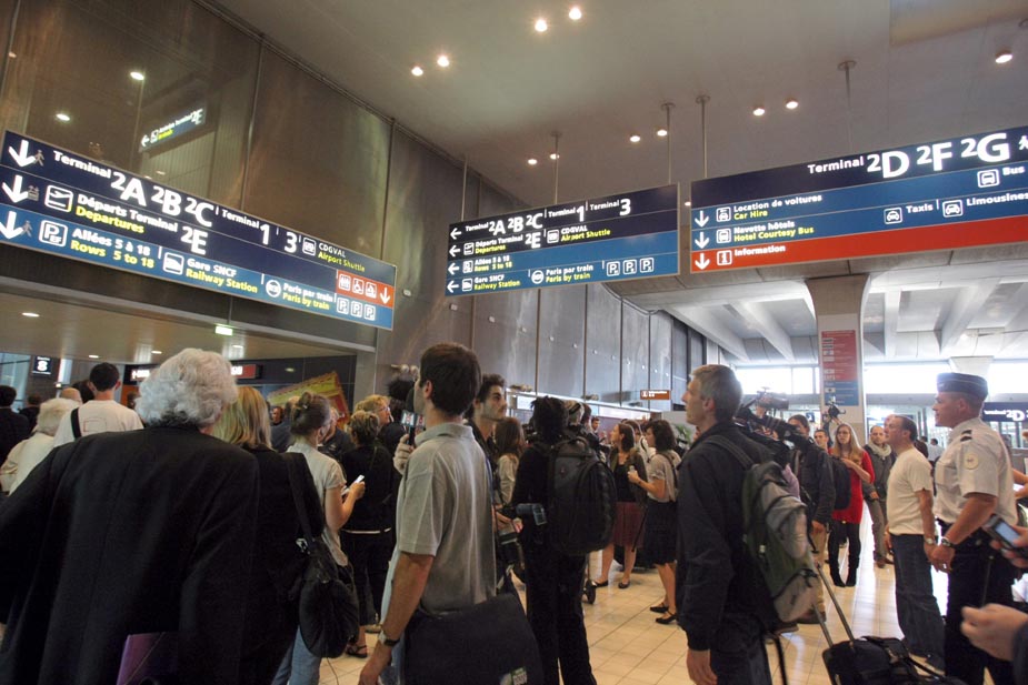 在法國戴高樂機場,接機者焦急等待該航班抵達。