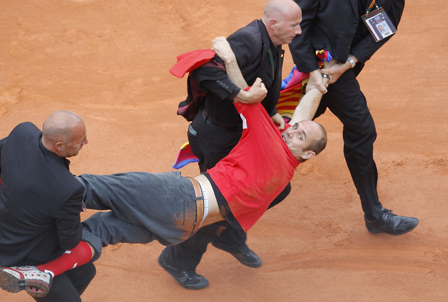 法網男單決賽場上,一位費天王的癡心球迷沖入球場,強行將自制的一頂帽子戴到費德勒的頭上。安保人員及時出現,將狂熱粉絲架出場外。