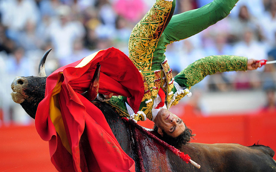 7月5日,西班牙巴塞羅那舉行了一場驚險的斗牛比賽,一位斗牛士在與牛較量時被牛頂起,所幸該人“武功”高強未造成大的傷害。
