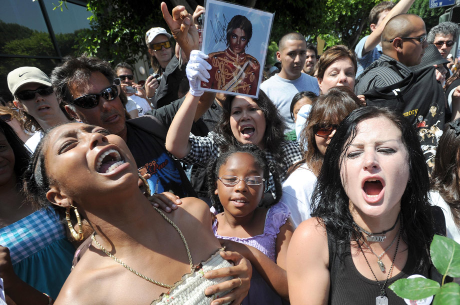 數(shù)百名沒有入場券的歌迷聚集在附近的警戒線外高呼邁克爾的名字,共同悼念一代“流行天王”。 中新社發(fā) 張煒 攝