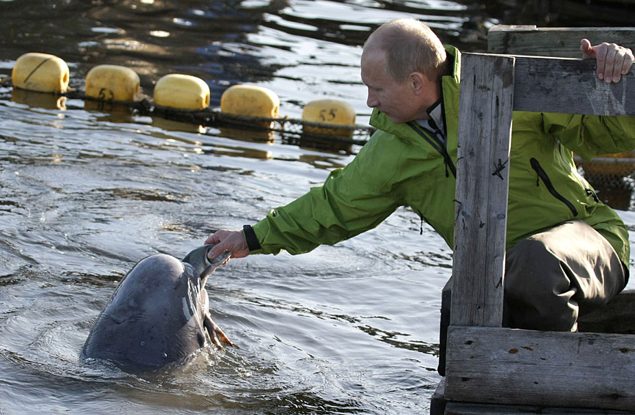 俄羅斯總理普京7月31日在太平洋的契卡洛夫島為一條白鯨裝上衛星追蹤器。其后他更幫手喂其他白鯨魚吃。