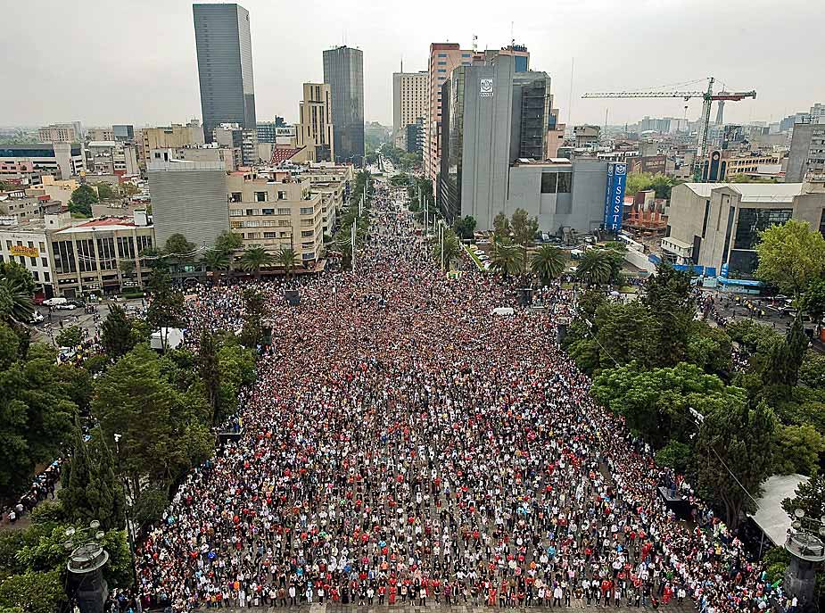 8月29日,逾萬名墨西哥人在墨西哥城廣場同時(shí)跳舞,用以紀(jì)念邁克爾·杰克遜第51個(gè)“生日”,同時(shí)也試圖打破同時(shí)跳舞人數(shù)最的吉尼斯世界紀(jì)錄。圖片來源:中國新聞網(wǎng)
