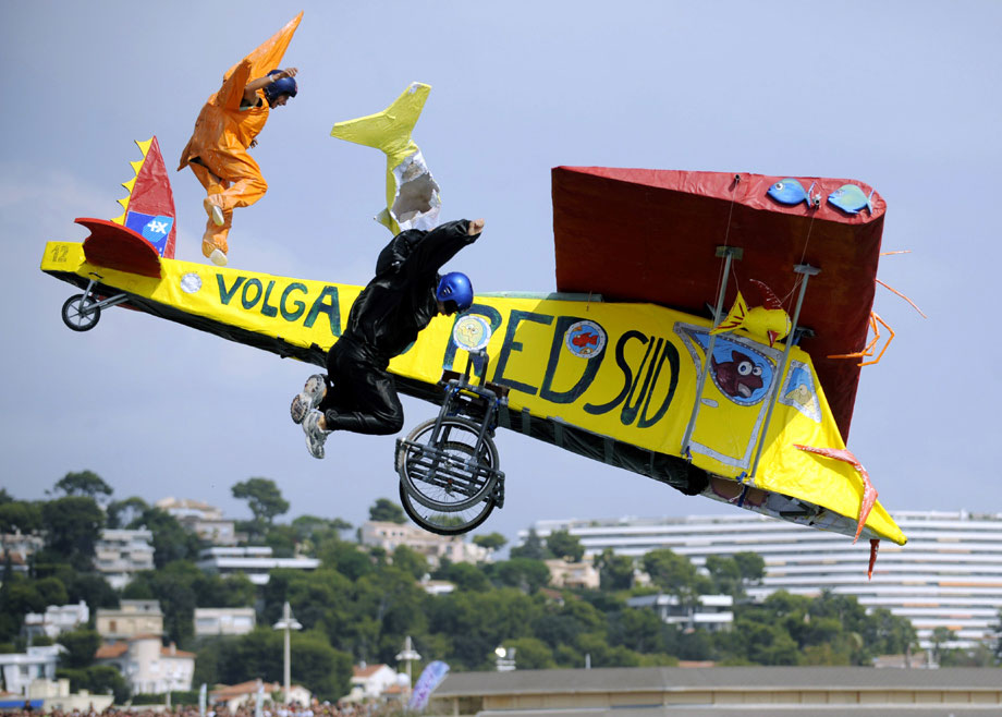 9月27日,法國馬賽趣味飛行器大賽舉行。比賽規則簡單,誰能在落水之前飛得更遠誰就是冠軍,但參賽選手絞盡腦汁,把自己的飛行器扮成各種古怪摸樣。圖片來源:中國新聞網