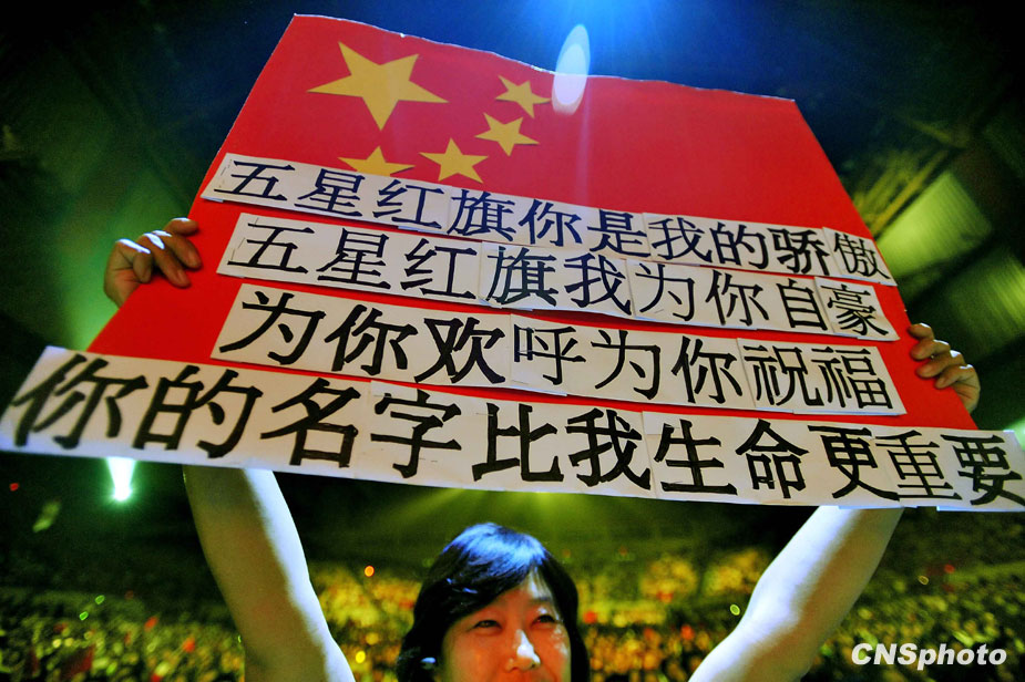 當地時間9月20日,以“感動世界,中國有我”為主題的全球華人共慶新中國成立六十周年《同一首歌》——走進美國舊金山大型演唱會圓滿落幕。 一位宮姓女士自制了一面五星紅旗,用獨特的方式祝福新中國六十華誕。 中新社發 陳鋼 攝