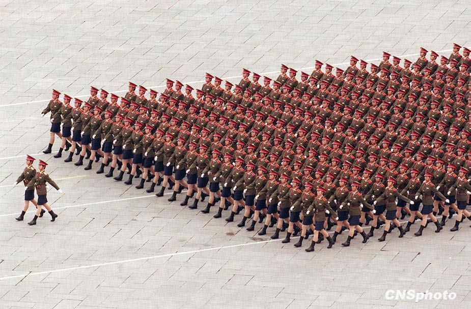 由白求恩軍醫學院學員組成的女兵方隊,邁著整齊的步伐經過天安門城樓。該校曾經組建中國閱兵史上的第一支女兵方隊參加國慶三十五周年的首都閱兵慶典。中新社發 任晨鳴 攝