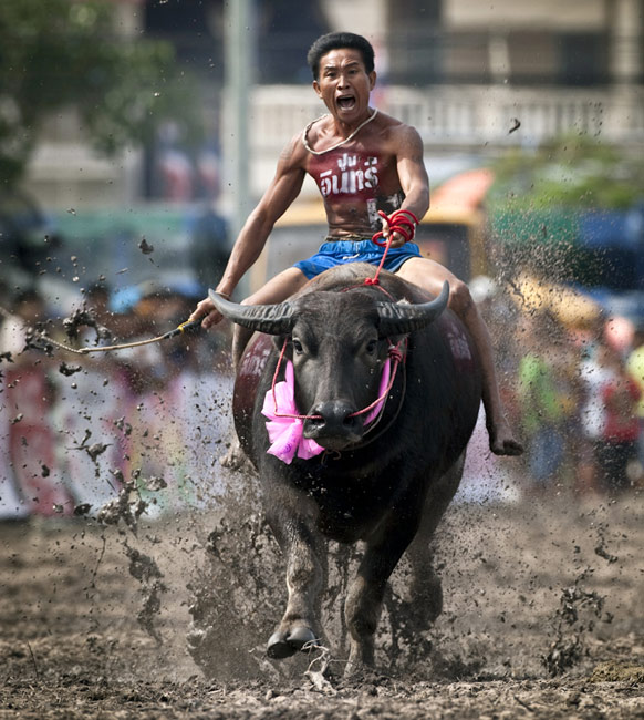 10月3日,泰國一年一度的騎水牛大賽在春武里舉行。