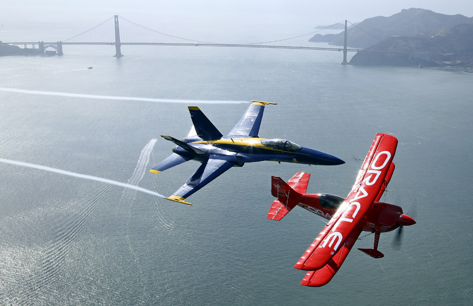 2009年10月8日,美軍飛機在舊金山灣上空進行飛行演練。一年一度的舊金山艦隊周將于10月10日開幕,屆時會有船艦游行和飛行表演等活動。 來源:中國新聞網