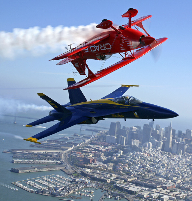 2009年10月8日,美軍飛機在舊金山灣上空進行飛行演練。一年一度的舊金山艦隊周將于10月10日開幕,屆時會有船艦游行和飛行表演等活動。 來源:中國新聞網