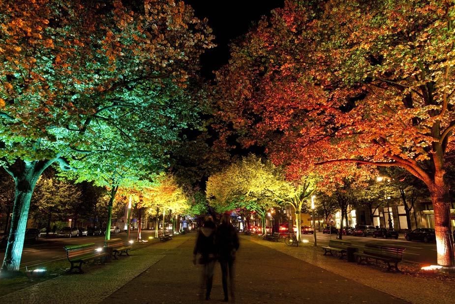 10月14日德國柏林將迎來一年一度的“燈節”。13日晚在德國首都柏林,著名的林蔭大道“菩提樹下大街”在“燈節”預演中被五彩燈飾照亮。