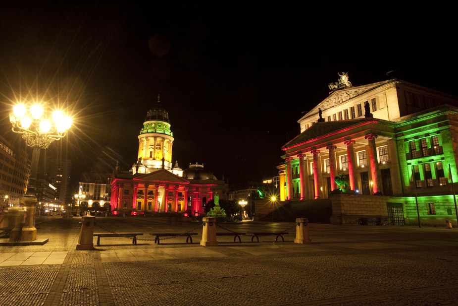 10月14日德國柏林將迎來一年一度的“燈節”。13日晚在德國首都柏林,柏林音樂廳在“燈節”預演中被五彩燈飾照亮。