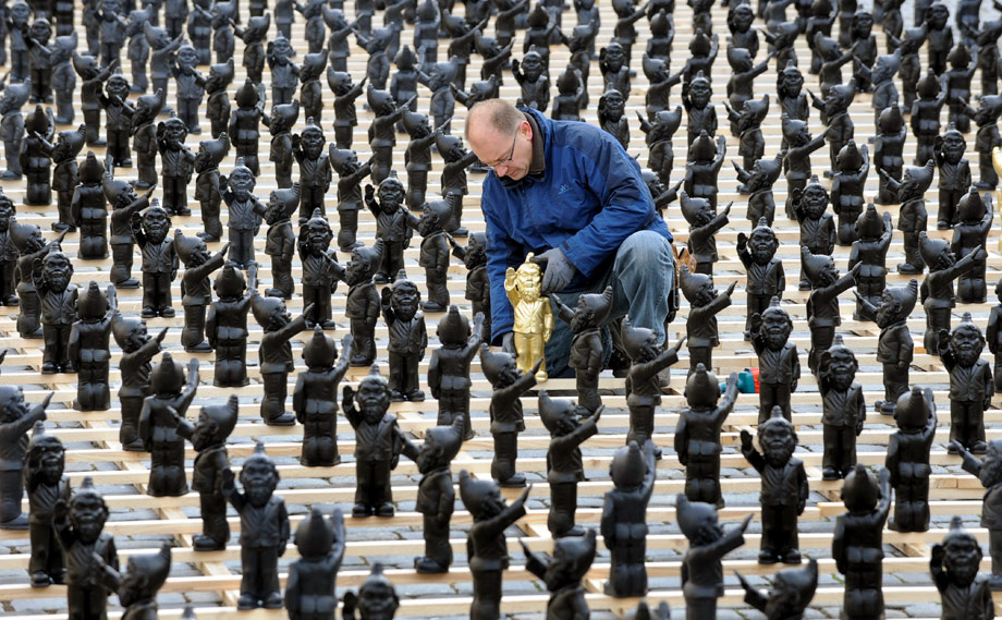 10月14日,德國施特勞賓市街頭擺放了1250個行納粹禮的花園土地神像,“行納粹禮的花園土地神”其實是一款雕塑作品,是由59歲的德國藝術家奧特馬爾·赫勒爾創作的目的在于提醒人們警惕法西斯思想,反對使用法西斯思想控制大眾。