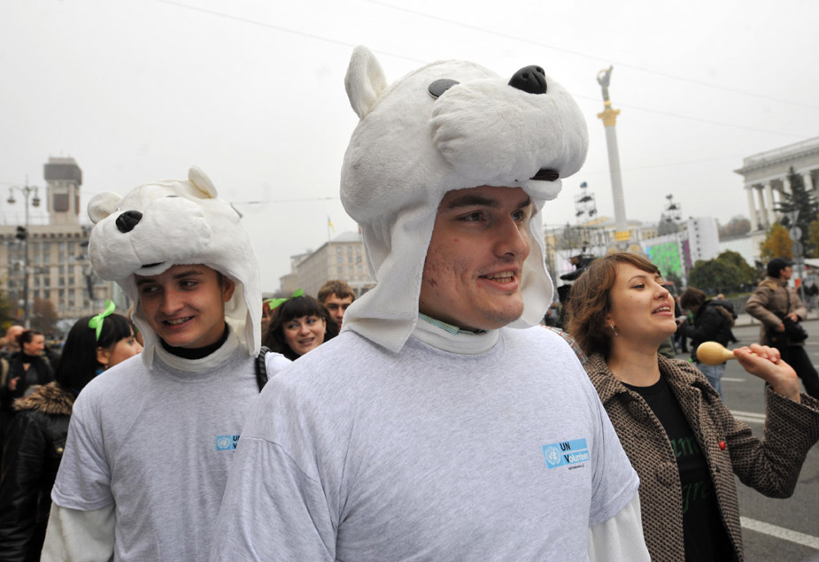2009年10月24日,當(dāng)日是350全球應(yīng)對氣候變化行動日,世界各地的民眾紛紛用自己的方式來表示對全球氣候變化的關(guān)注和擔(dān)憂。圖為烏克蘭民眾組織的活動。