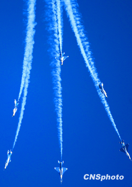 慶祝中國人民解放軍空軍成立60周年飛行表演,11月15日上午在北京沙河機場舉行。表演按八一飛行表演隊4架殲-10飛機表演12個動作和6架殲-7GB飛機表演15個動作,分四機對頭交叉、四機菱形隊大坡度盤旋、單機小速度平飛等27個動作,其中四機對頭交叉動作是這次表演中技術難度較大的動作之一,這是國產三代飛機和國產二代飛機首次同場競技表演。圖為殲-7GB表演六機向下開花。中新社發(fā) 宋吉河 攝