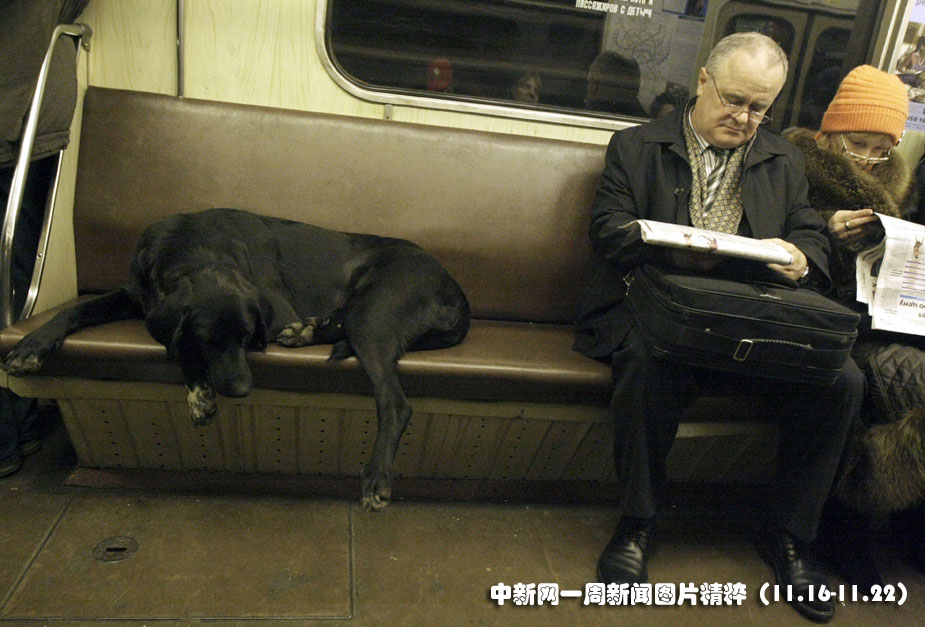 2009年11月18日,俄羅斯首都莫斯科的一只流浪狗與乘客同乘地鐵。圖片來源:中國新聞網(wǎng)