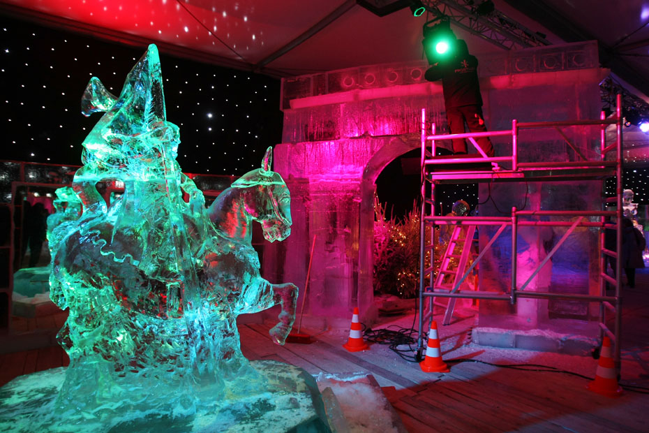 11月23日,為期一個月的“冰之魔術”藝術展在法國巴黎香榭麗舍開幕,16位藝術家利用440噸冰雕刻出精美的巴黎地標建筑和著名藝術家羅丹的“思想者”雕塑。圖片來源:中國新聞網