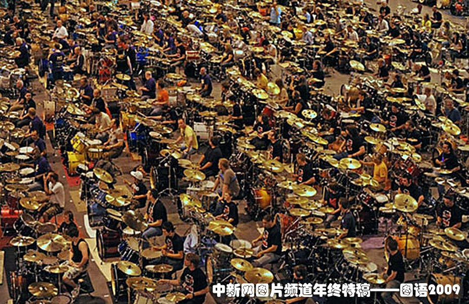 世界最多的鼓手同時打鼓:582名架子鼓手齊聚一堂,同時擊打同樣的鼓點長達5分鐘,和諧程度如出自一人之手,令人咋舌,同時也創下了又一項新的吉尼斯世界紀錄。圖片來源:中國新聞網