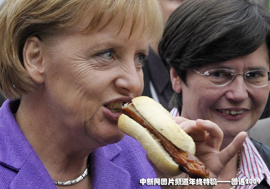 美食的誘惑:2009年9月27日,德國(guó)總理默克爾在德國(guó)東部愛爾福特市訪問(wèn)時(shí),大吃香腸。