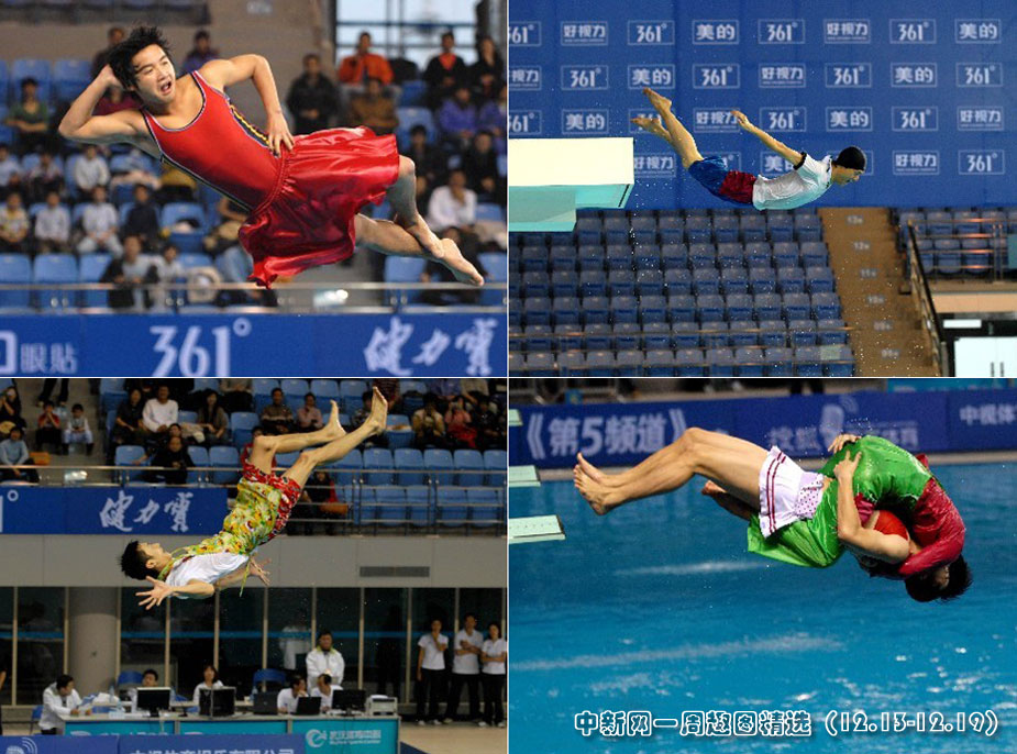 12月17日,首屆中國跳水明星系列賽在武漢體育中心游泳館開賽。在比賽間隙,扮裝怪異的滑稽跳水,逗得現場觀眾樂開懷。圖片來源:中國新聞網>>點擊觀看詳細內容