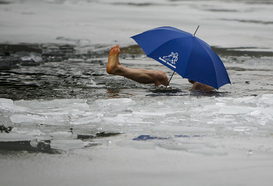 12月25日,德國柏林的冬泳俱樂部“柏林海豹”(Berliner Seehunde)的成員不畏寒冬,光著身子在已經結冰的Oranke湖中暢游一番。圖片來源:中國新聞網