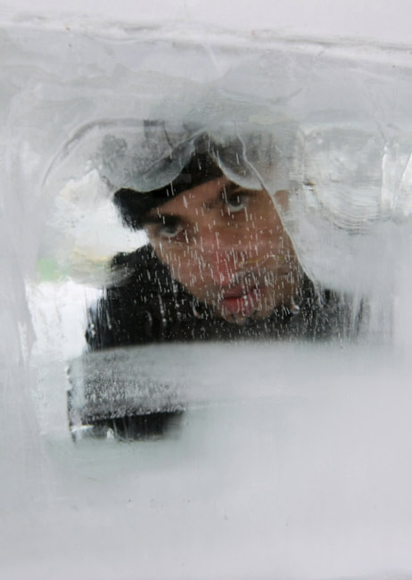 當地時間29日早上8點起,以色列魔術師赫齊·達揚在位于特拉維夫的拉賓廣場上,達揚赤身進入一塊8噸重的冰塊里,開始了挑戰冰屋生存世界紀錄之旅。圖片來源:中國新聞網
