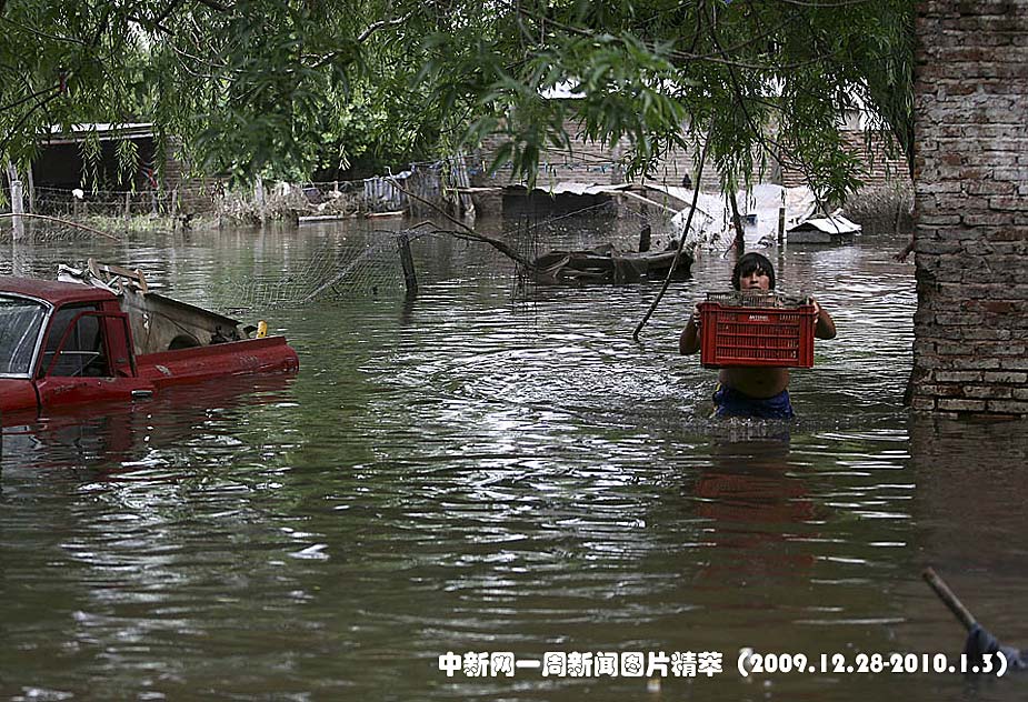 周一(28日)在阿根廷的圣安東尼.德.阿萊科,一名少年托著裝有鳥的籠子在洪水泛濫的街道行走。阿萊科河沿岸的洪水已造成至少兩人死亡,數(shù)千人被迫撤離。圖片來源:中國新聞網(wǎng)