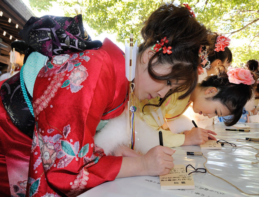 今年的1月11日,是日本傳統(tǒng)的成人節(jié),所有滿20歲的年輕人將宣告自己邁進(jìn)了成人行列。1月8日,日本一家公司年滿20歲的年輕女孩紛紛穿上和服,到廟宇中祈福,提前慶祝成人節(jié)的到來(lái)。