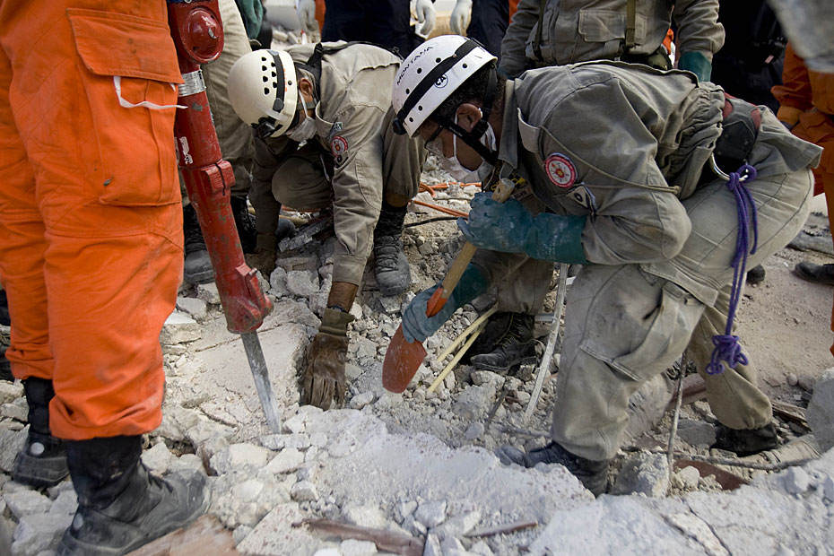 1月16日,海地首都太子港,中國國際救援隊在聯海團總部對遇難者進行搜尋工作。此前八名中方失蹤人員的遺體已全被找到。圖片來源:中國新聞網