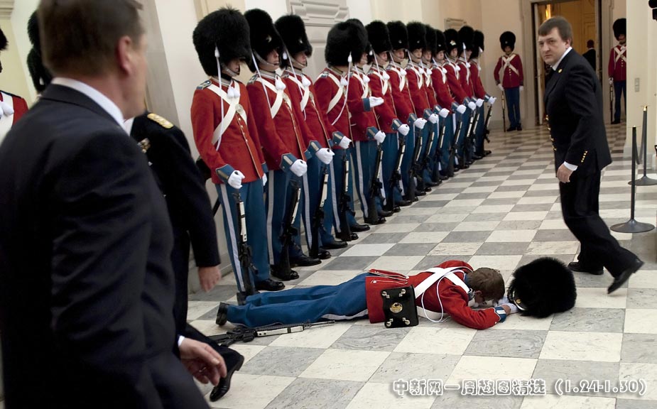 1月27日,丹麥女王在首都哥本哈根設宴款待議會議員,一名皇家衛兵突然暈倒在地,不知是否站得太久餓暈了。圖片來源:中國新聞網>>點擊觀看詳細內容