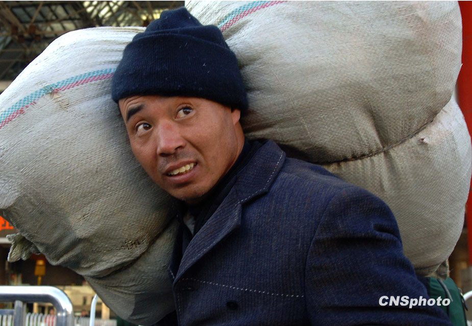 一年一度的春運(yùn)今日起正式開始。2010年的春運(yùn)從1月30日起至3月10日,為期40天,其中節(jié)前15天,節(jié)后25天。據(jù)權(quán)威預(yù)測(cè),今年春運(yùn)客運(yùn)量料超25億人次。 1月30日,北京西站廣場(chǎng)上,一名中國(guó)民工扛著行囊和打工的收獲,返鄉(xiāng)過節(jié)。中新社發(fā) 鄒憲 攝