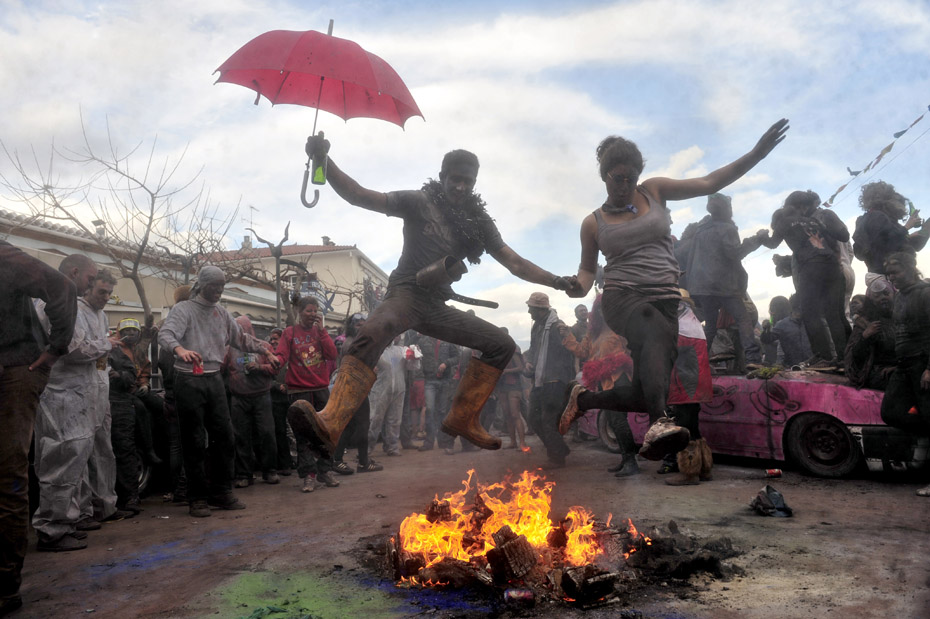 2月15日,希臘港口加拉西迪,狂歡者在街頭參加“面粉大戰”!懊娣鄞髴稹笔钱數貞c?駳g季結束的一項傳統活動,隨后將是為期40天的齋戒月直至復活節。圖片來源:中國新聞網