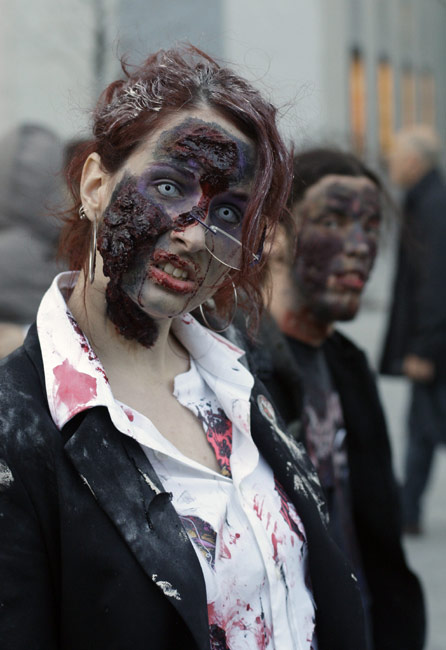 當地時間2月27日,在西班牙馬德里,眾多愛好者裝扮成“僵尸”的模樣,在街頭舉行巡游活動。