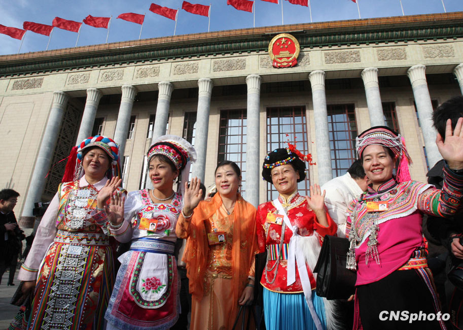 3月5日上午9時,十一屆全國人大三次會議在北京隆重開幕。國務院總理溫家寶作政府工作報告。圖為少數民族女代表盛裝出席人大開幕會。 中新社發 湯彥俊 攝