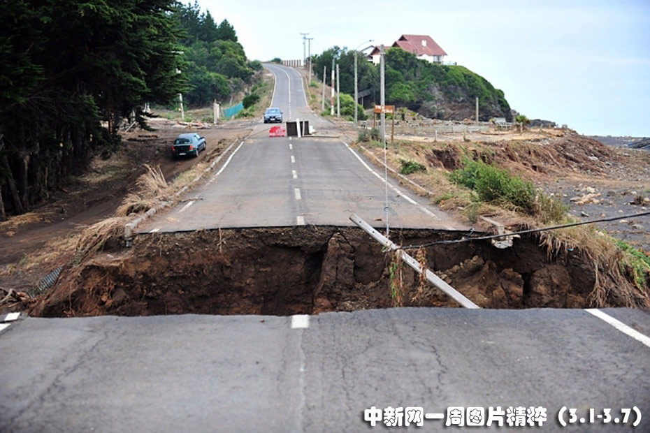 3月2日,在智利佩尤韋,一條公路發(fā)生斷裂。智利大地震已過(guò)去3天,目前已有至少796人喪身。智利總統(tǒng)巴切萊特稱(chēng),部隊(duì)已經(jīng)部署到位。此外她還會(huì)見(jiàn)了美國(guó)國(guó)務(wù)卿希拉里•克林頓。政府部門(mén)已經(jīng)開(kāi)始分發(fā)食物。圖片來(lái)源:中國(guó)新聞網(wǎng)