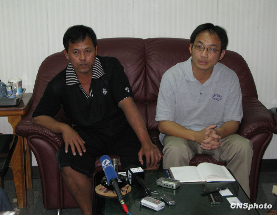 圖為3月6日“穩發161號”船長顏勝男(左)、穩發漁業公司經理劉銘復(右)在高雄接受大陸記者采訪,他們感謝大陸船東協會提供及時幫助、海軍提供柴油、伙食和護航。 中新社發 耿軍 攝
