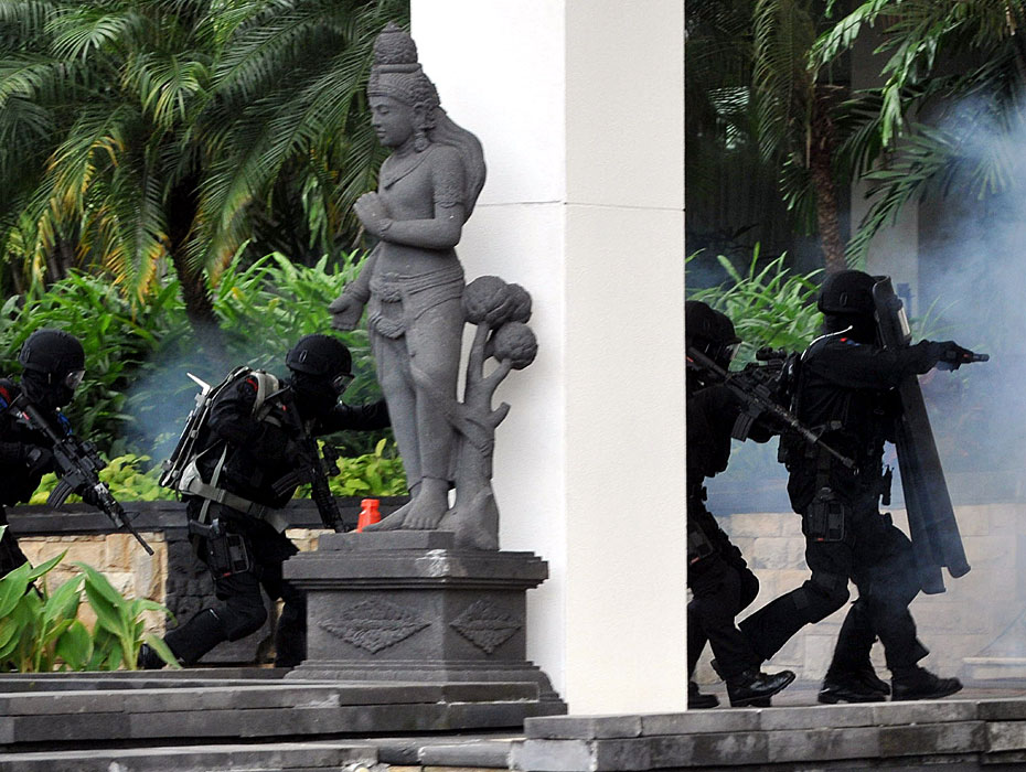 3月13日,印尼警方在首都雅加達的證券交易所舉行了一場反恐演習,為本月底即將到訪印尼的美國總統(tǒng)奧巴馬創(chuàng)造安全的環(huán)境。圖片來源:中國新聞網(wǎng)