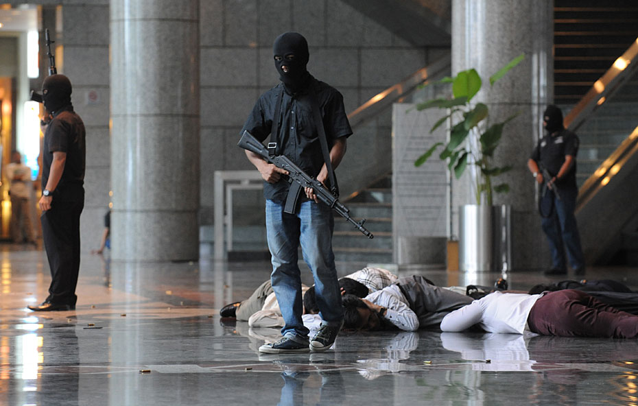 3月13日,印尼警方在首都雅加達的證券交易所舉行了一場反恐演習,為本月底即將到訪印尼的美國總統奧巴馬創造安全的環境。圖片來源:中國新聞網