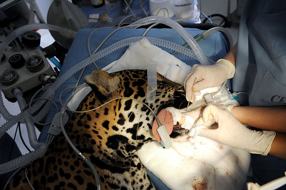 3月13日,在哥倫比亞麥德林附近的一個(gè)獸醫(yī)診所,一只雌性美洲虎在接受牙齒手術(shù)。圖片來源:中國新聞網(wǎng)