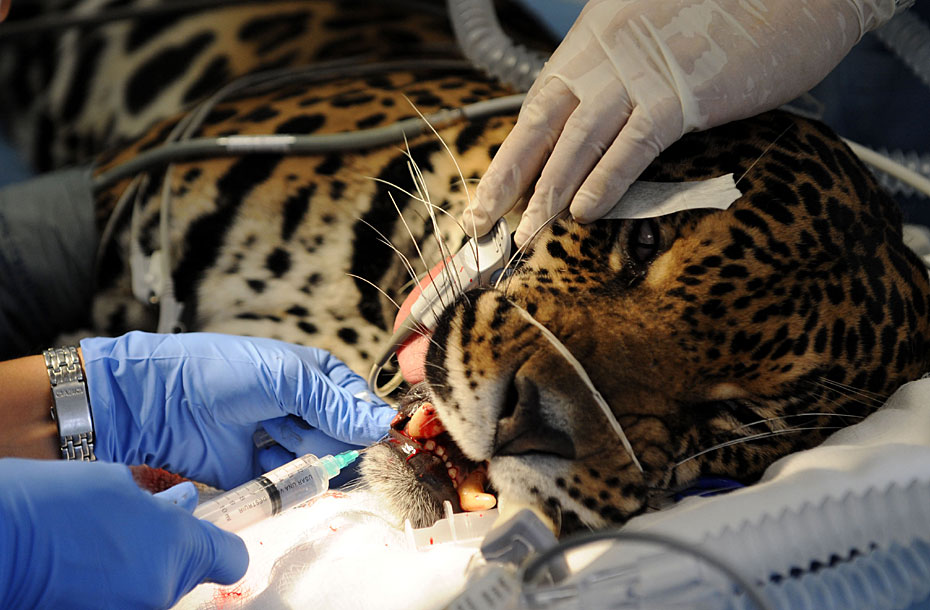3月13日,在哥倫比亞麥德林附近的一個獸醫診所,一只雌性美洲虎在接受牙齒手術。圖片來源:中國新聞網