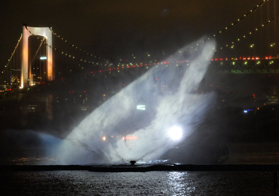 3月19日晚,在日本東京灣上演了一場美輪美奐的“海上幻燈”。東京灣的噴泉噴射出長60米、高23米的各種海洋生物的畫面,令人驚嘆。