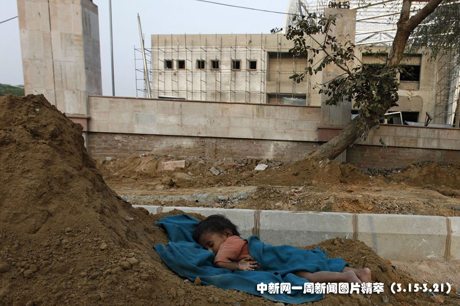 18日(周四),印度新德里,一個孩子在英聯邦運動會體育場外的工地上睡覺。