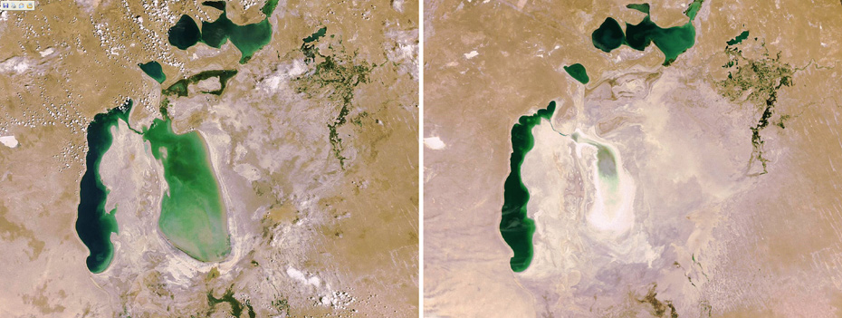 2009年7月10日歐洲航天局公布的照片顯示了號稱世界第四大內(nèi)陸水體的咸海從06年至09年海岸線急劇回落的過程。咸海的消失其實(shí)是人類無度開發(fā)利用水資源行為的惡果。