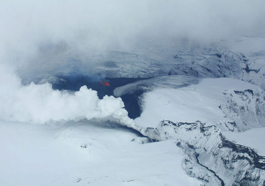 3月21日,冰島首都雷克雅未克東南方向的埃亞菲亞德拉冰蓋冰川,熔巖從火山口噴出。 這座火山于20日午夜前后就開始噴發。圖片來源:中國新聞網