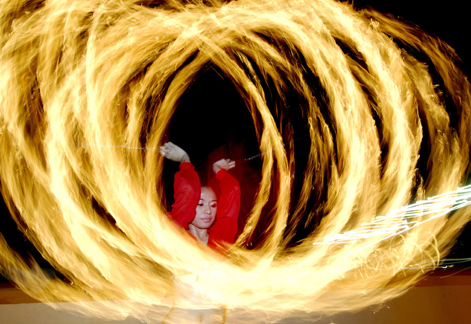 當地時間3月25日,在菲律賓馬尼拉,一名舞者在火焰中“熱舞”。