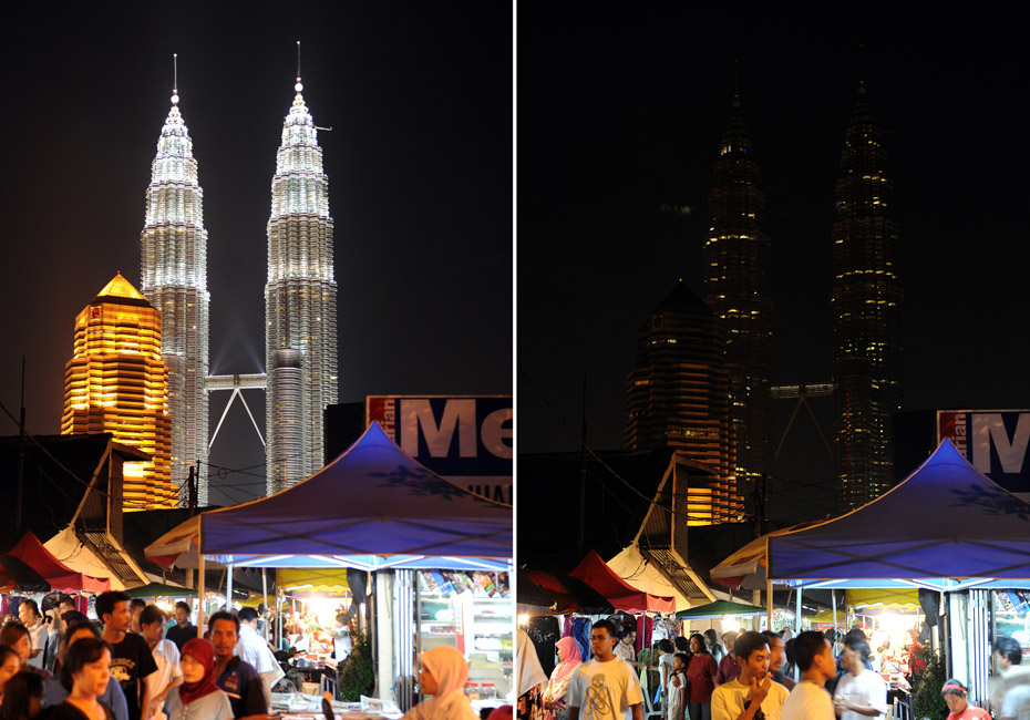 由世界自然基金會發起的“地球一小時”環保活動27日20點30分按照時區依次在全球數千個城市展開。圖為馬來西亞吉隆坡雙子星塔在參與“地球一小時”熄燈活動前與熄燈后的情況。