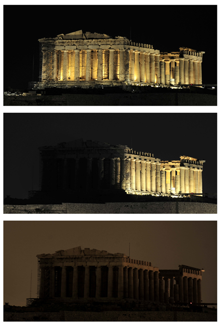 由世界自然基金會(huì)發(fā)起的“地球一小時(shí)”環(huán)保活動(dòng)27日20點(diǎn)30分按照時(shí)區(qū)依次在全球數(shù)千個(gè)城市展開。圖為希臘帕特農(nóng)神廟在熄燈前和熄燈后的景色。