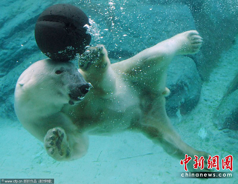 美國Asheboro北卡羅來納動物園一頭名叫威利的北極熊可是個“活寶”。任何一個可用的東西都能成為它在鏡頭前“耍寶”的玩具。圖片來源:CFP