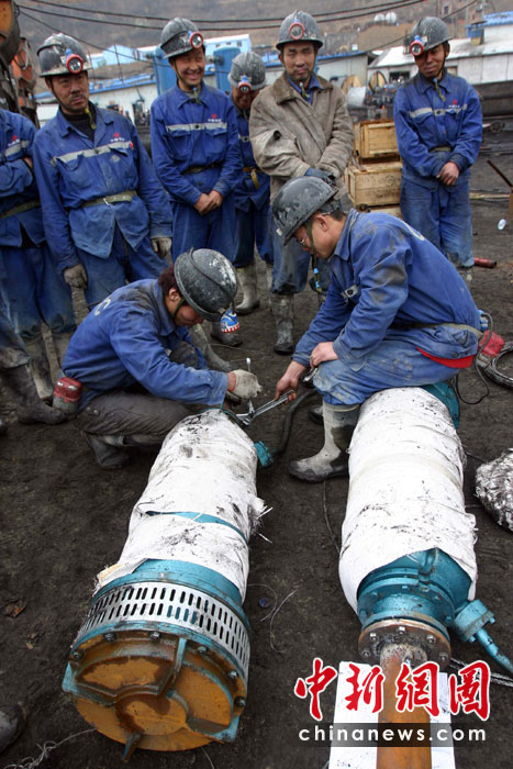3月29日上午,山西華晉焦煤有限責(zé)任公司王家?guī)X煤礦透水事故搶險工作正在緊張進(jìn)行中。為救援被困礦工,多方支援的搶險器材、礦山救護(hù)隊已經(jīng)陸續(xù)抵達(dá)現(xiàn)場。圖為即將組裝完畢的水泵。中新社發(fā) 張云 攝