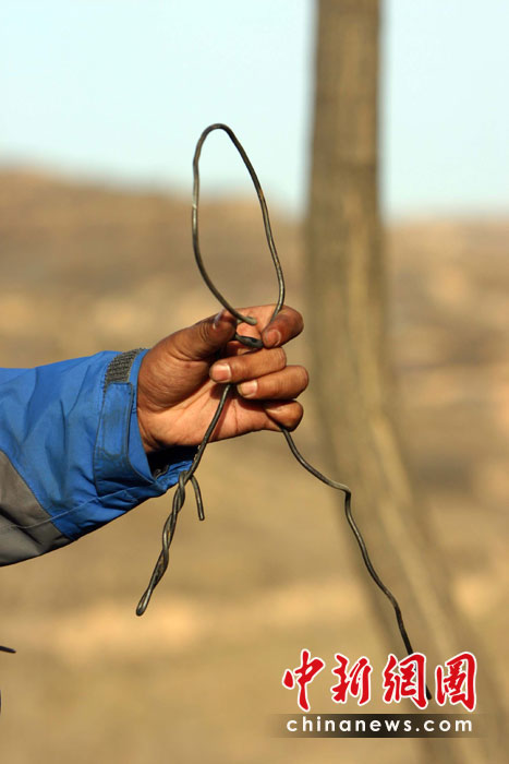 4月2日下午,華晉焦煤公司王家嶺礦透水事故搶險人員為井下有生命跡象的2號垂直鉆孔輸送營養液,并靜聽井下人員反饋回音。圖為2號垂直鉆孔鉆桿頭抽出時,鉆桿頭上綁著帶來生命跡象的鐵絲。中新社發 張云 攝