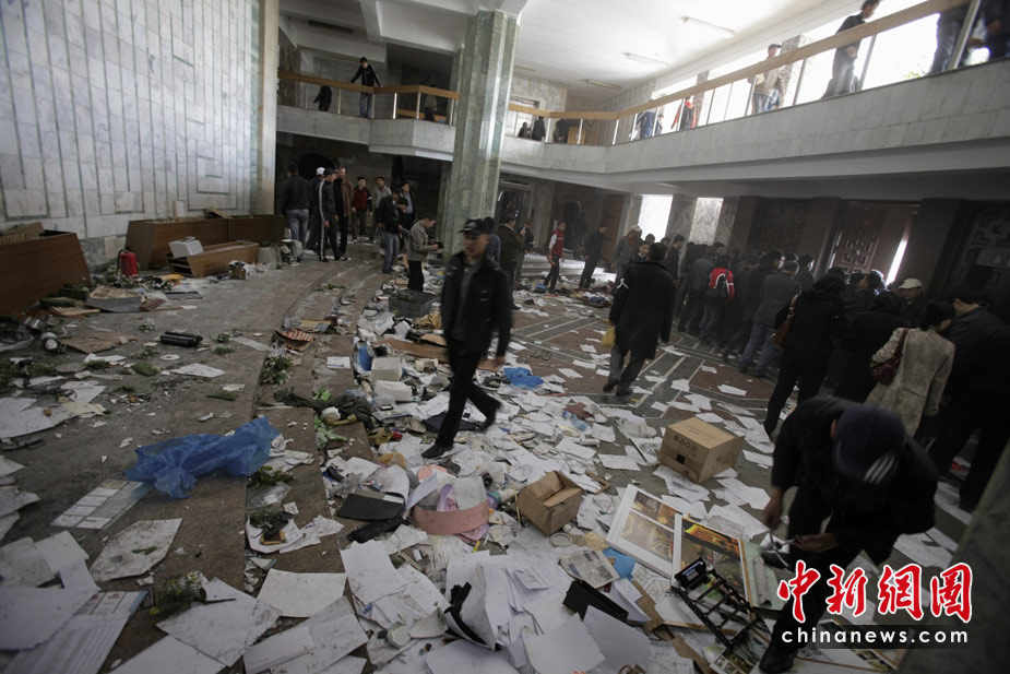 吉爾吉斯斯坦7日發生大規模騷亂,反對派示威者占領了議會大樓,8日,總統府也被示威者占領。圖為政府總部一片狼藉。